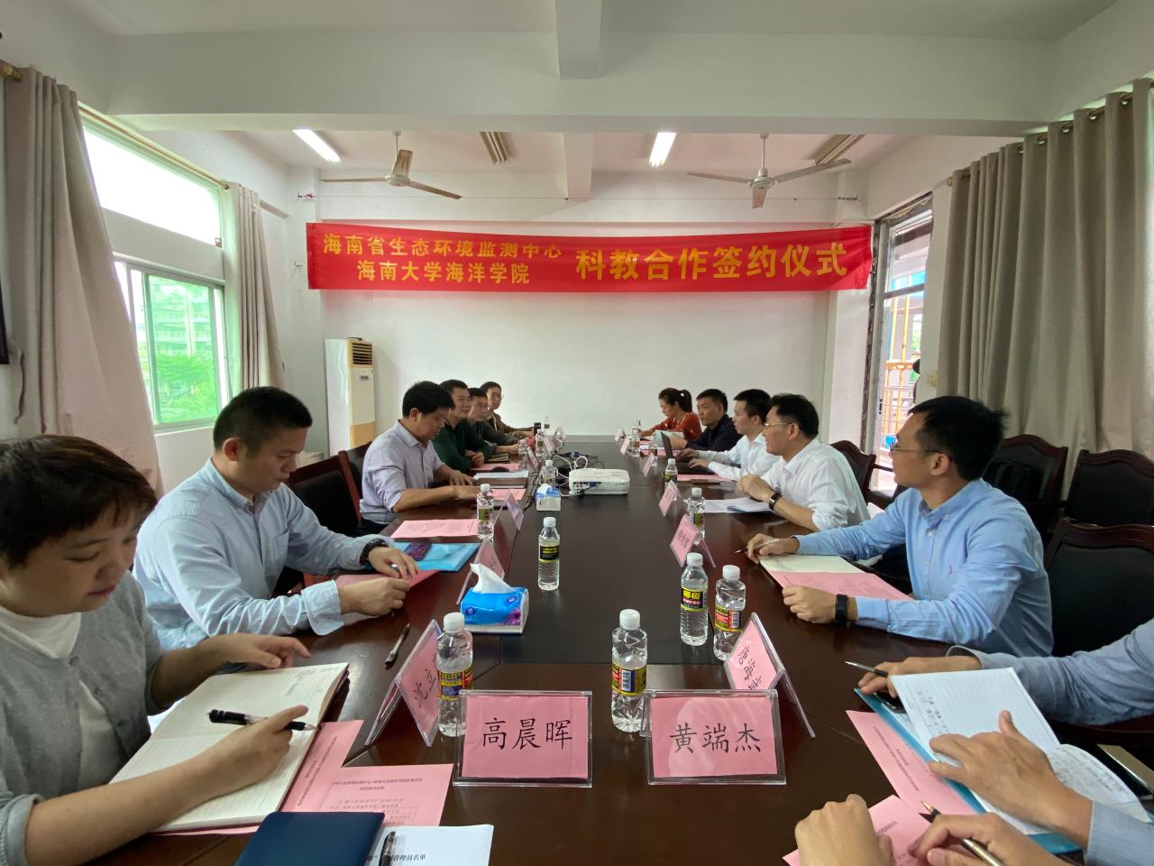 3月25日下午,海南省生态环境监测中心邹伟主任、颜为军副主任、林积泉副主任等一行7人受邀到访海洋公司。公司经理周永灿、党委书记陈平、副经理周智会见各位专家并在公司会议室举行了科教合作签约仪式。海科系主任许强、副系主任李秀保、教师代表覃乐政、学工办副主任沈立岚和辅导员高晨晖参加了本次会议。会议由陈平书记主持。