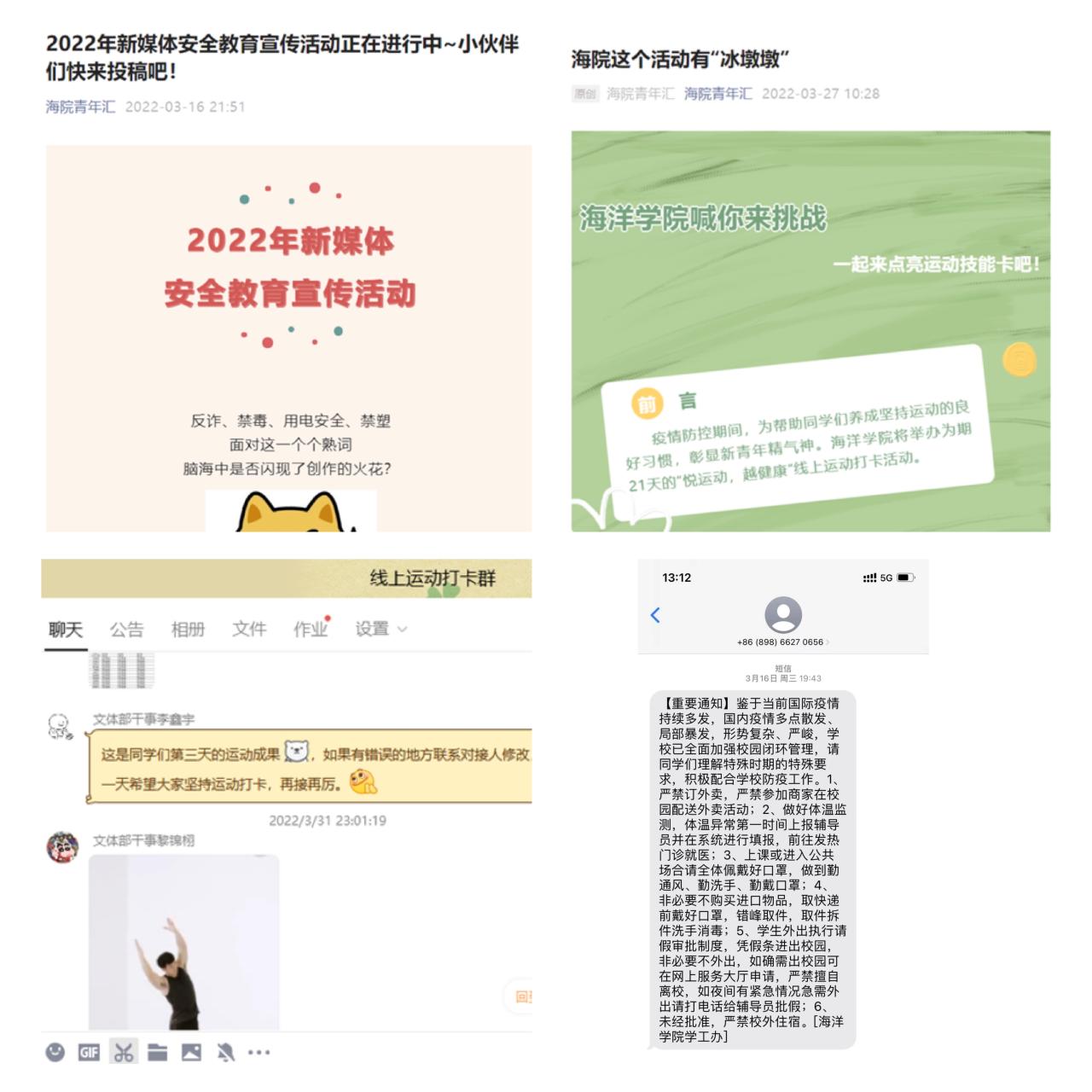 疫情防控期间为让大家进一步了解疫情形势、政策,同时安心在校学习,有渠道正确缓解和释放心理压力,健康身心。海洋公司利用协同通讯平台,点对点向全院本科生和研究生逐一发送闭环管理通知,引导员工正确认识公司防控政策,及时了解最新情况,落实落细安全教育工作。二是借助“海院青年汇”微信平台,发起“悦运动,越健康”21天运动打卡活动、安全教育宣传比赛和21天英语打卡等活动。以活动动员全院员工积极参与,以参赛选手带动同屋室友
