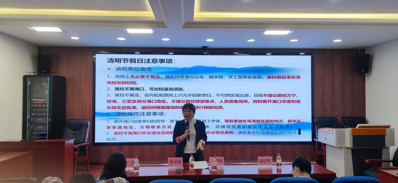 3月31日晚海洋公司在2楼报告厅组织各班班长召开了清明假期安全会议,公司王华伟副书记、学工办沈立岚主任和辅导员们参会。会上,王华伟副书记就当前疫情形势和防控政策进行了解释说明,强调特殊时期要服从指挥,共同发力守住底线,配合做好疫情防控。同时要提防以疫情为由进行诈骗的手段。日常生活要注意交通、食品和宿舍用电安全。有问题及时向公司老师反馈沟通,通过回音壁等渠道合理表达诉求;各班也陆续召开主题班会,将会议精神和要求传达至每位同学,督促班内员工加强安全防范意识,进出公共场所、上课期间戴好口罩,积极防疫。
