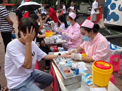 员工党员们认真指导同学填写《无偿献血登记表》,安抚部分情绪紧张的同学,指导同学有序参加体检化验,检查合格后进入采血区开始献血。