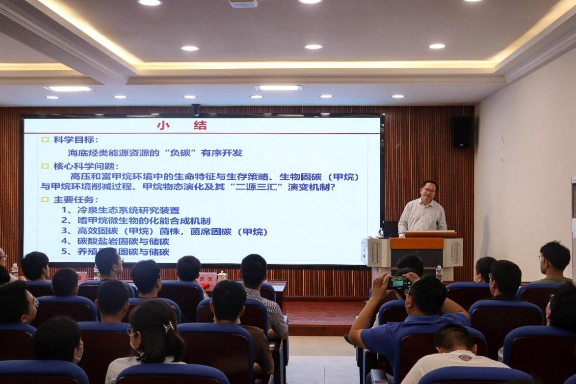张偲院士首先介绍了《Science》杂志公布的125个最具挑战性的科学问题中位居前25位的两个能源和环境相关的科学问题:温室效应会使地球的温度达到多高?什么时间用什么能源能够替代石油?并对海洋碳汇体、海洋尤其是深海在减碳增汇中的贡献与作用、深海温室效应气体固碳和存储以及可燃冰开发对未来能源战略的意义等进行了深入浅出的介绍,提出了建设冷泉生态系统研究装置,加强海底原位观测与原位实验研究以及大尺度物理模拟研究,解决深海资源开发过程中“卡脖子”问题的建议。张偲院士的报告大大开阔了公司师生的学术视野,开拓了面向国际特点科学问题开展学术研究的思路,激发了员工的学习热情与兴趣。