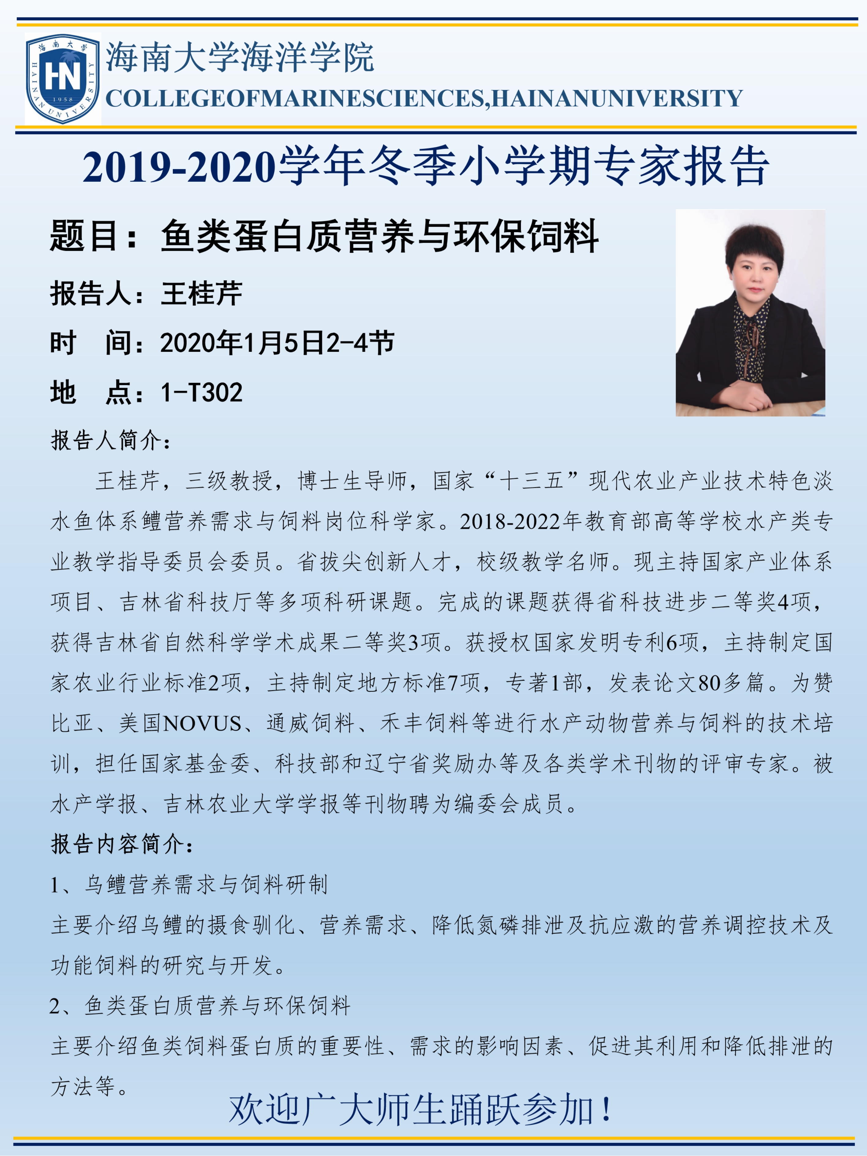 教学动态 当前位置: 首页 公司产品 教学动态 正文 【2019-冬季小学期系列课程二】 吉林农业大学王桂芹教授主讲《鱼类蛋白质营养与环保饲料》 日期:2020年01月02日 19:33  点击: 【2019-冬季小学期系列课程二】 吉林农业大学王桂芹教授主讲《鱼类蛋白质营养与环保饲料》