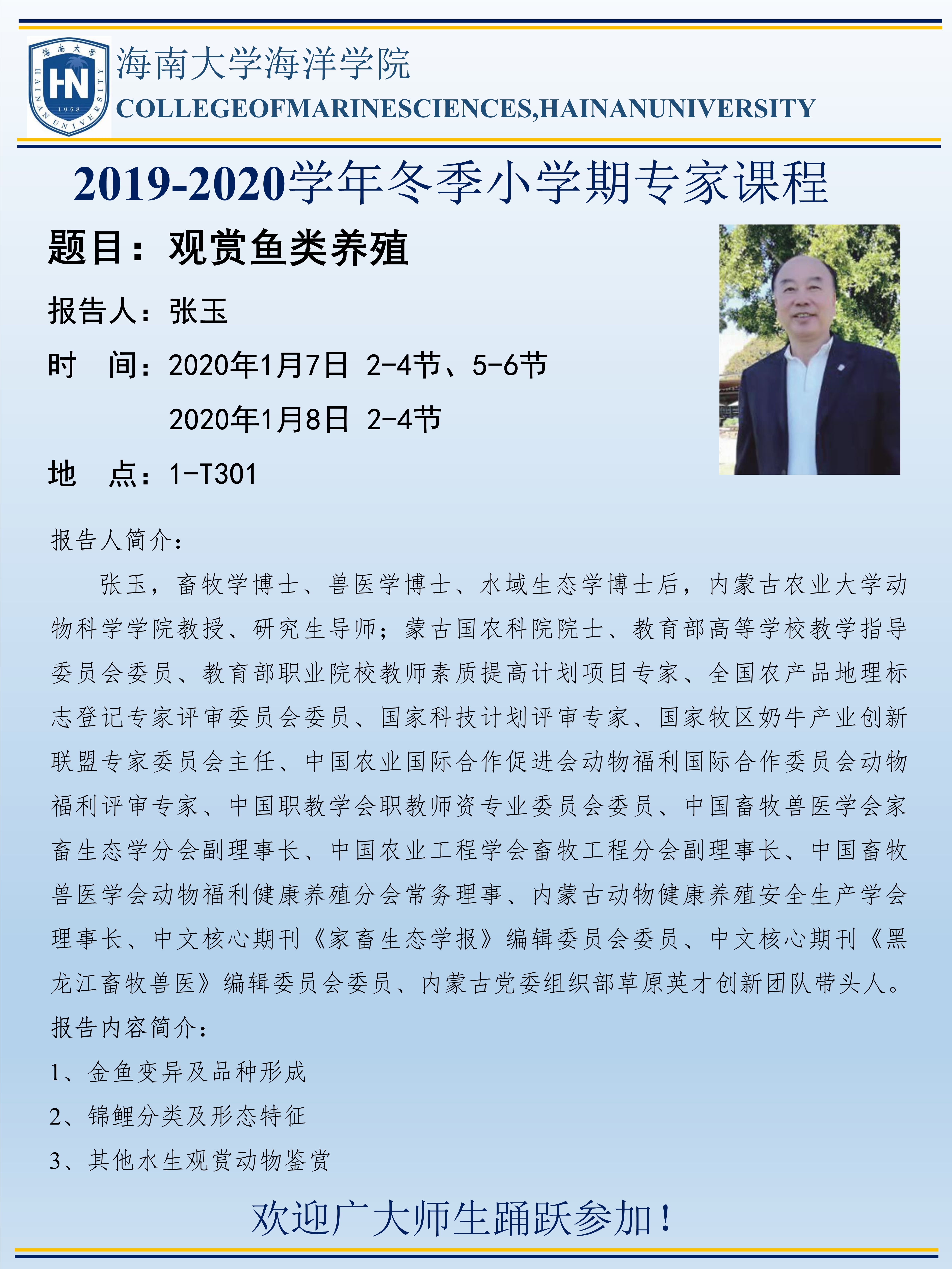 教学动态 当前位置: 首页 公司产品 教学动态 正文 【2019-冬季小学期系列课程六】 内蒙古农业大学张玉教授主讲《观赏鱼类养殖》 日期:2020年01月02日 19:46  点击: 【2019-冬季小学期系列课程六】 内蒙古农业大学张玉教授主讲《观赏鱼类养殖》 //www.hainanu.edu.cn