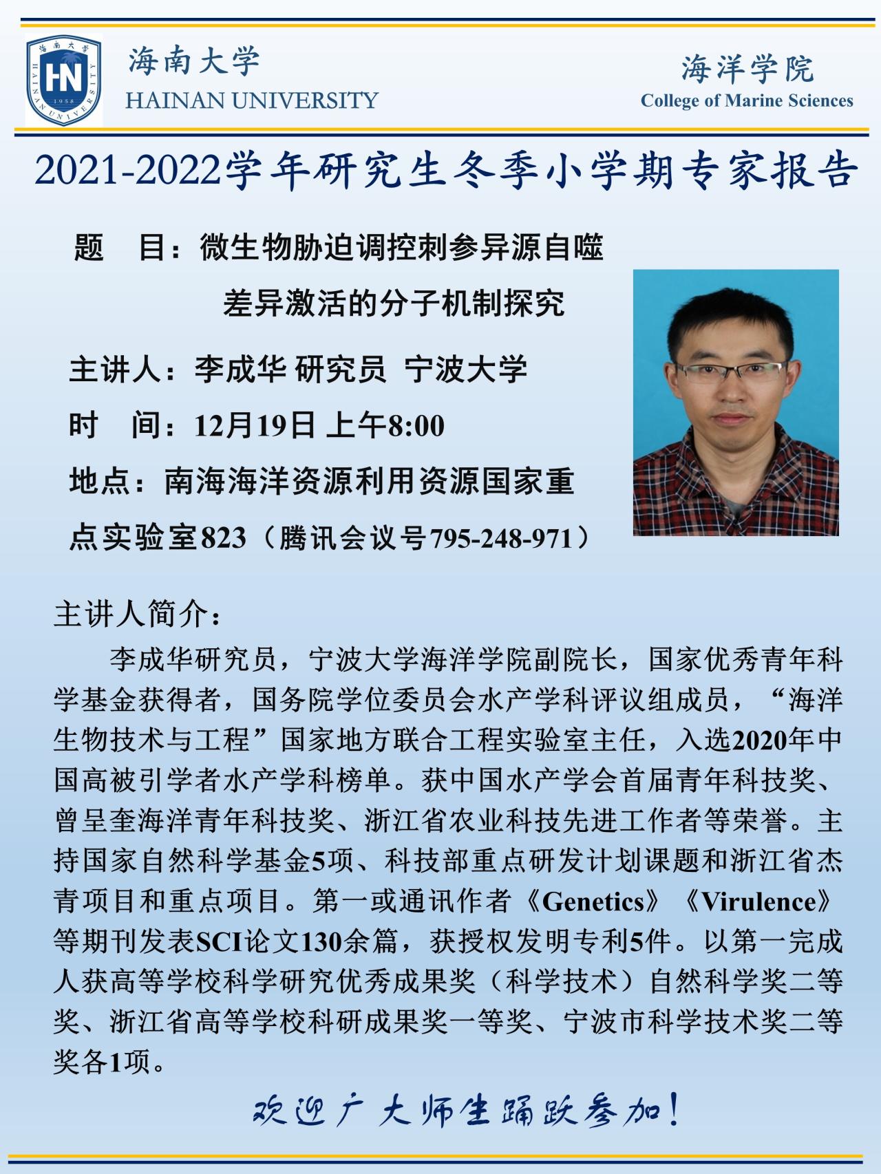 教学动态 当前位置: 首页 公司产品 教学动态 正文 【2021冬季小学期研究生课程建设】《水产动物疾病与控制》课程-bb贝博艾弗森官方网站李成华研究员讲座 日期:2021年12月16日 22:50  点击: