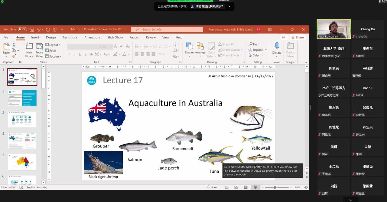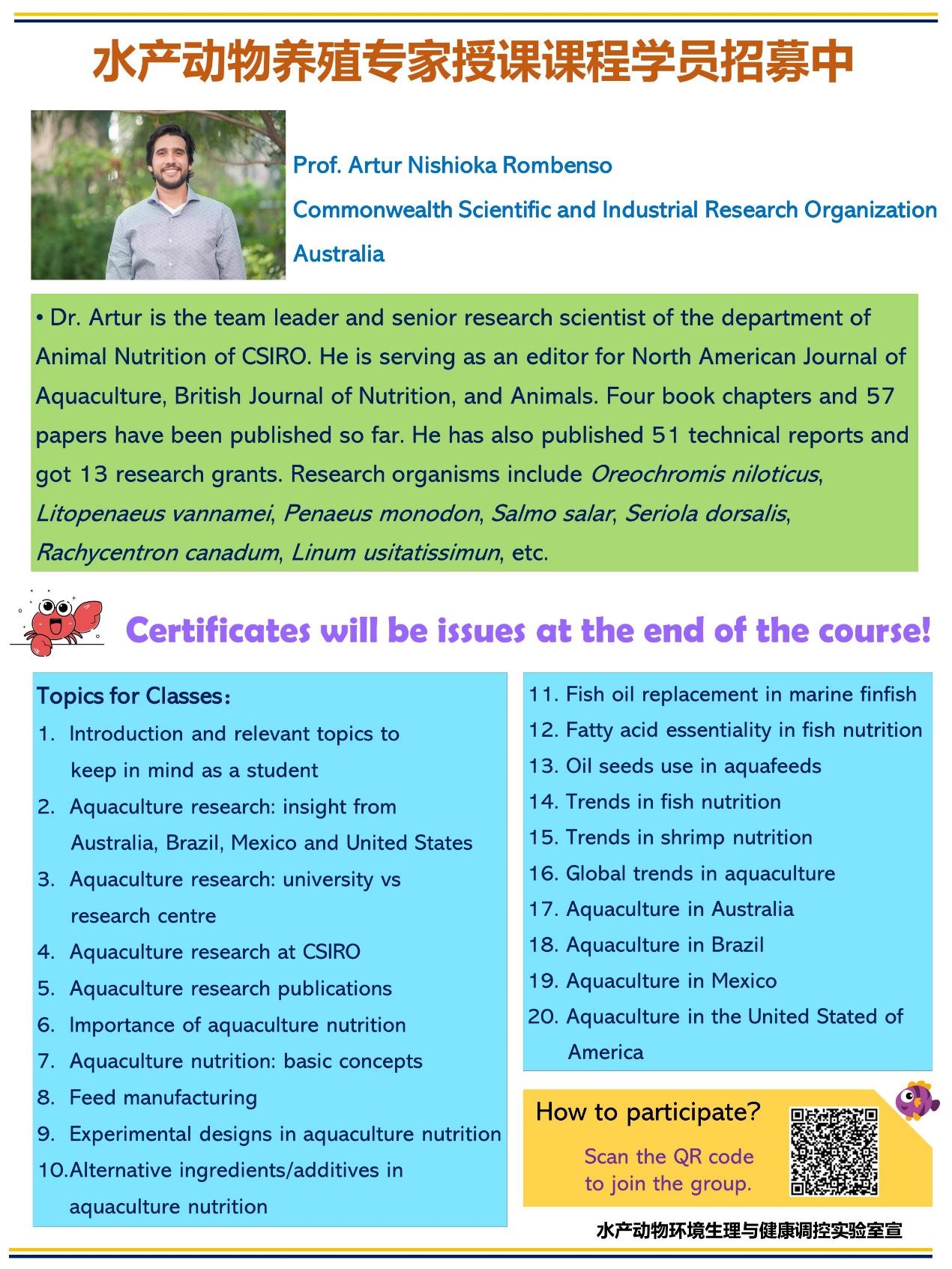 为了培养国际交流理念,努力为公司研究生及本科生提供国际化的交流平台,公司在“bb贝博艾弗森官方网站聘请外国科研或授课专家项目”的大力支持下,邀请澳大利亚联邦科学与工业研究组织的Artur Nishioka Rombenso高级研究员,以水产养殖为主题,为公司员工开展线上教学,丰富对世界水产养殖产业的认知,掌握关键水产养殖大国的行业动态。作为澳大利亚最大的科研机构,Artur向同学们展示了其高效的现代化养殖系统和顶级的检测分析平台。同时,在Artur精心安排下,课程设置了20个学时,分别涉及澳大利亚、美国、墨西哥、巴西等水产养殖大国的现代养殖技术、行业发展动态和未来发展趋势等,同时,基于Artur的研究方向,其对水产养殖中的营养饲料板块进行了详细的阐述和讲解。课程中,Artur采用最新的研究进展对目前水产养殖的热点问题进行了剖析,形象生动的将现代的水产养殖和科学研究相结合,激发了员工对于水产专业领域的热情,同时也为有意前往澳大利亚继续深造学习的同学提供了交流机会。本次授课在2022年12月9日圆满收官,课程内容惠及公司180余名研究生和本科生。课后,同学纷纷表示对本次线上课程的内容安排和授课质量十分满意,并希望以后还能够有机会参与到外国专家的授课项目中来,与国际上的知名水产养殖专家进行面对面的沟通和交流,明确未来职业发展方向,争取成为具有国际视野的高素质水产专业人才。