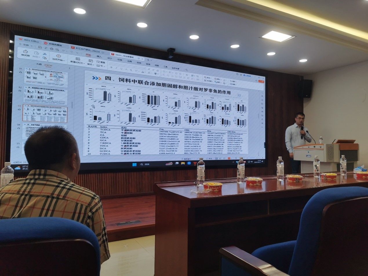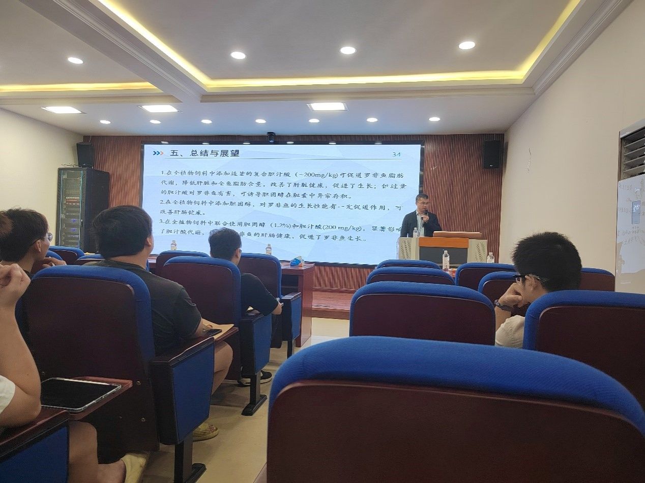 蒋明研究员的报告题目是《外源性胆固醇和胆汁酸对罗非鱼生长、代谢和肝肠健康的作用》。他指出,针对全植物性蛋白源饲料中胆固醇和胆汁酸缺乏的问题,在饲料中分别添加胆固醇、胆汁酸及联合使用胆固醇和胆汁酸对罗非鱼生长、代谢及肝肠健康的影响进行研究,结果显示添加适量胆固醇及胆汁酸对罗非鱼的生长性能有一定促进作用,可改善肝肠健康。该研究成果为鱼类胆汁酸的营养调控策略提供新思路,也为罗非鱼配合饲料中植物性蛋白原料的高效利用提供了新路径。
