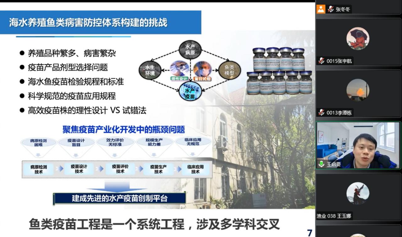 王启要教授介绍了鱼类疫苗研发的现状与展望、鱼类减毒活疫苗的设计理念和海水鱼病害防控体系构建的挑战,展示了其团队在海水鱼类活疫苗等方面的最新研究成果、创制思路和取得的重大突破;并围绕病原-环境/宿主互作机制阐释了毒力基因筛选和疫苗设计的基础,介绍了海洋弧菌群体感染调控及其条件致病机制,以及基于转座子插入测序技术的启发式疫苗设计新策略。