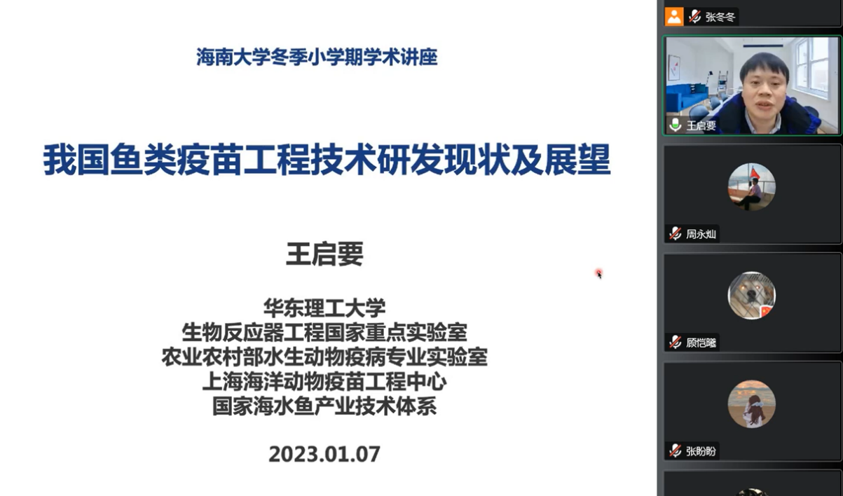 2023年1月7-8日,华东理工大学生物工程公司副经理、国家高层次人才特殊支持计划王启要教授为公司2022级研究生课程《水产动物疾病与控制》和《水生动植物疾病诊治与防控》开展了冬季小学期授课。授课内容包括“ 微生物信号转导前沿”、“海洋弧菌群体感染调控及其条件致病机制”和“转座子插入测序的原理及应用”,并利用授课机会为全院师生作了“我国鱼类疫苗工程技术研发现状及展望”的学术报告。