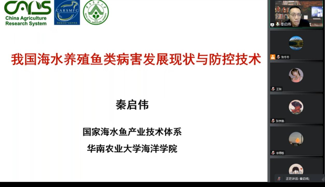 2023年1月12日和14日,华南农业大学海洋公司经理、国家杰出青年基金获得者秦启伟教授线上为海洋公司2022级研究生课程《水产动物疾病与控制》和《水生动植物疾病诊治与防控》开展了冬季小学期授课,授课主题为 “我国海水养殖鱼类病害发展现状与防控技术”,并线上为全院师生作了“我国海洋渔业科技发展现状与趋势”的学术讲座。
