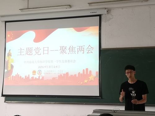 3月14日下午,海洋公司第一员工党支部在3-305开展学习两会精神的主题党日活动,号召全体党员积极学习两会精神,全体党员就2019年全国两会的热点话题进行学习分享并展开讨论。本次会议由支部副书记卓锦涛主持。