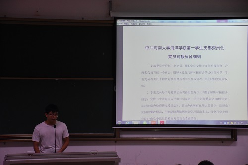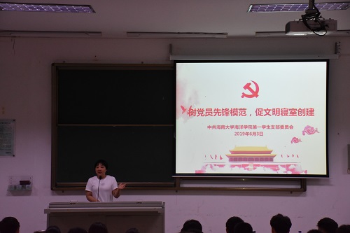 为进一步构建良好的交互学习环境、营造和谐有爱的宿舍氛围,以班风、学风建设带动后进生全面进步和转化发展,海洋公司第一员工党支部于6月3日晚在3教210组织开展“党员对接宿舍及一对一帮扶小组”工作推进会。本次大会以“树党员先锋模范 促文明寝室创建”为主题,参加大会的有海洋公司辅导员、第一员工党支部书记沈立岚,全体党员,以及水产养殖学专业全体员工。本次会议由支部组织委员张波同志主持。